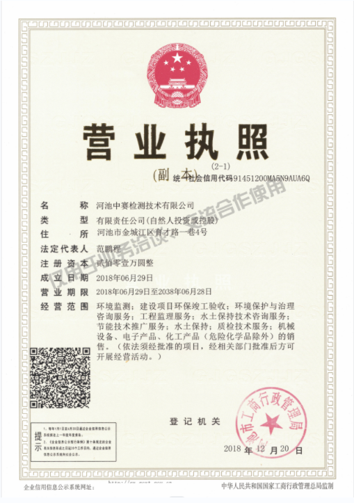 河池中賽檢測(cè)技術(shù)有限公司位于廣西壯族自治區(qū)河池市金城江區(qū)育才路一巷4號(hào),于2018年06月成立,2019年03月25日通過(guò)廣西壯族自治區(qū)質(zhì)量技術(shù)監(jiān)督局的審查并獲得計(jì)量認(rèn)證CMA資質(zhì)(證書(shū)編號(hào):192012051116),是河池第一家專(zhuān)業(yè)從事環(huán)境檢測(cè)的第三方機(jī)構(gòu),公司現(xiàn)有檢測(cè)能力包含水和廢水(含大氣降水)、環(huán)境空氣和廢氣、室內(nèi)空氣、土壤和沉積物、固體廢物、煤質(zhì)、噪聲和振動(dòng)等七大類(lèi)。業(yè)務(wù)范圍涵蓋:環(huán)境監(jiān)測(cè)、環(huán)??⒐を?yàn)收、環(huán)保工程、環(huán)評(píng)、應(yīng)急預(yù)案、排污許可申報(bào)等。